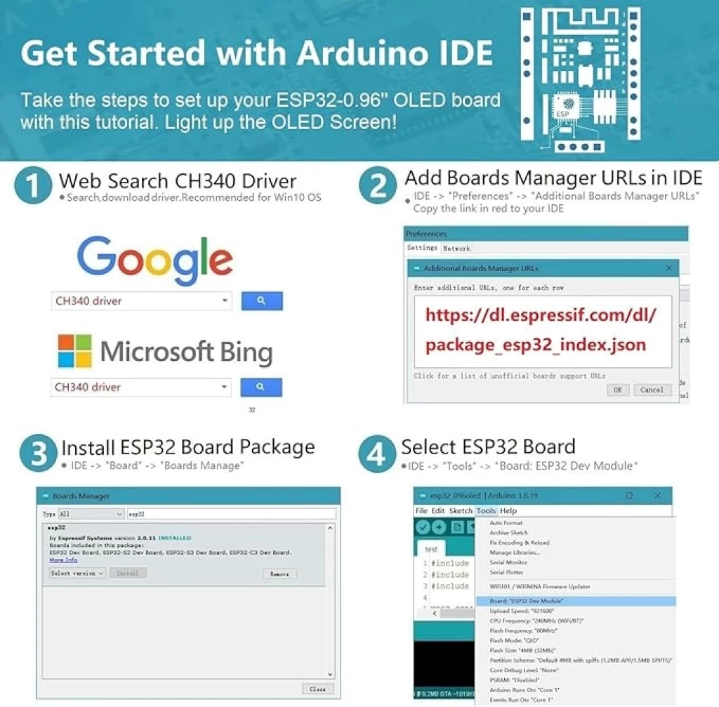 ESP32 Development Board Integrated 0.96 Inch OLED Display,CH340 Driver,WiFi+BLE Wireless Module,and Micro USB Works Great for Arduino/Micropython